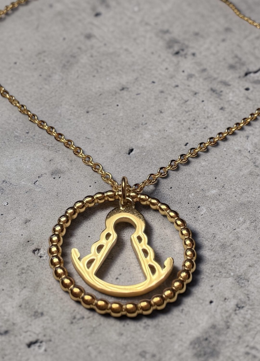 Colgante de la virgen del rocio al completo en color dorado con imagen impresa en la medalla